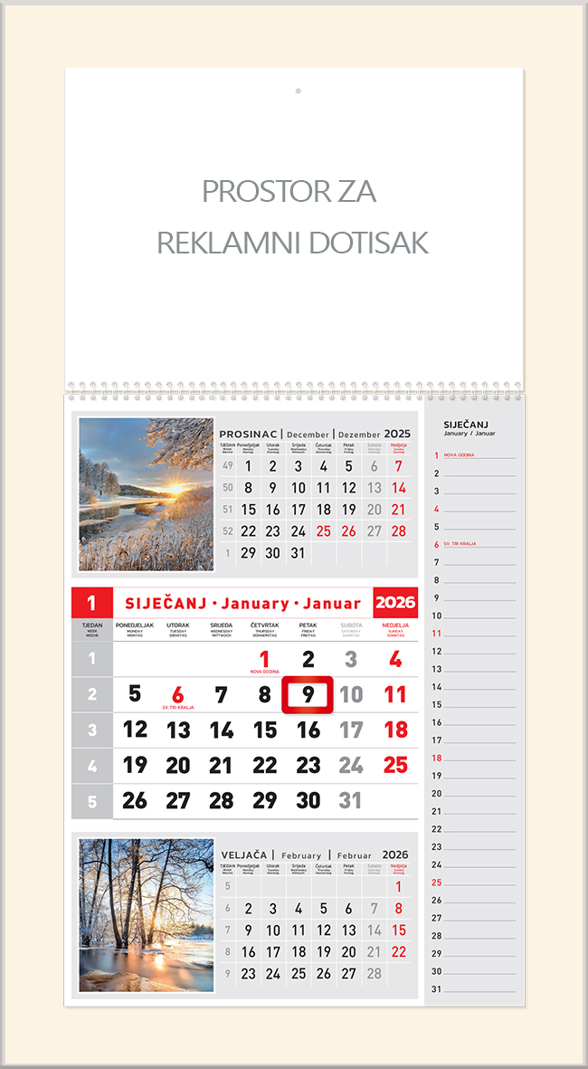 Format: 19,5 x 28 cm Reklamni prostor: 19,5 x 15 cm Kalendarij:12 listova, uvez spirala, pokazivač datuma jahač Jezici: hrvatski, engleski i njemački Dotisak: 1-4 boje ili kolor Pakiranje: vrećica (50 kom)