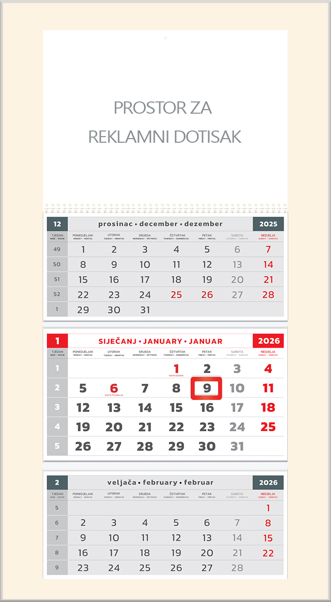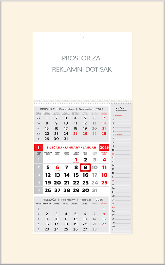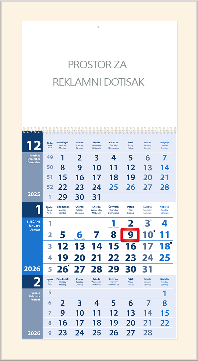 Format: 40 x 30 cm Reklamni prostor: 21 x 29,7 cm Kalendarij: 12 listova, uvez spirala, pokazivač datuma jahač Jezici: hrvatski, engleski i njemački Dotisak: 1-4 boje ili kolor Pakiranje: vrećica (50 kom)